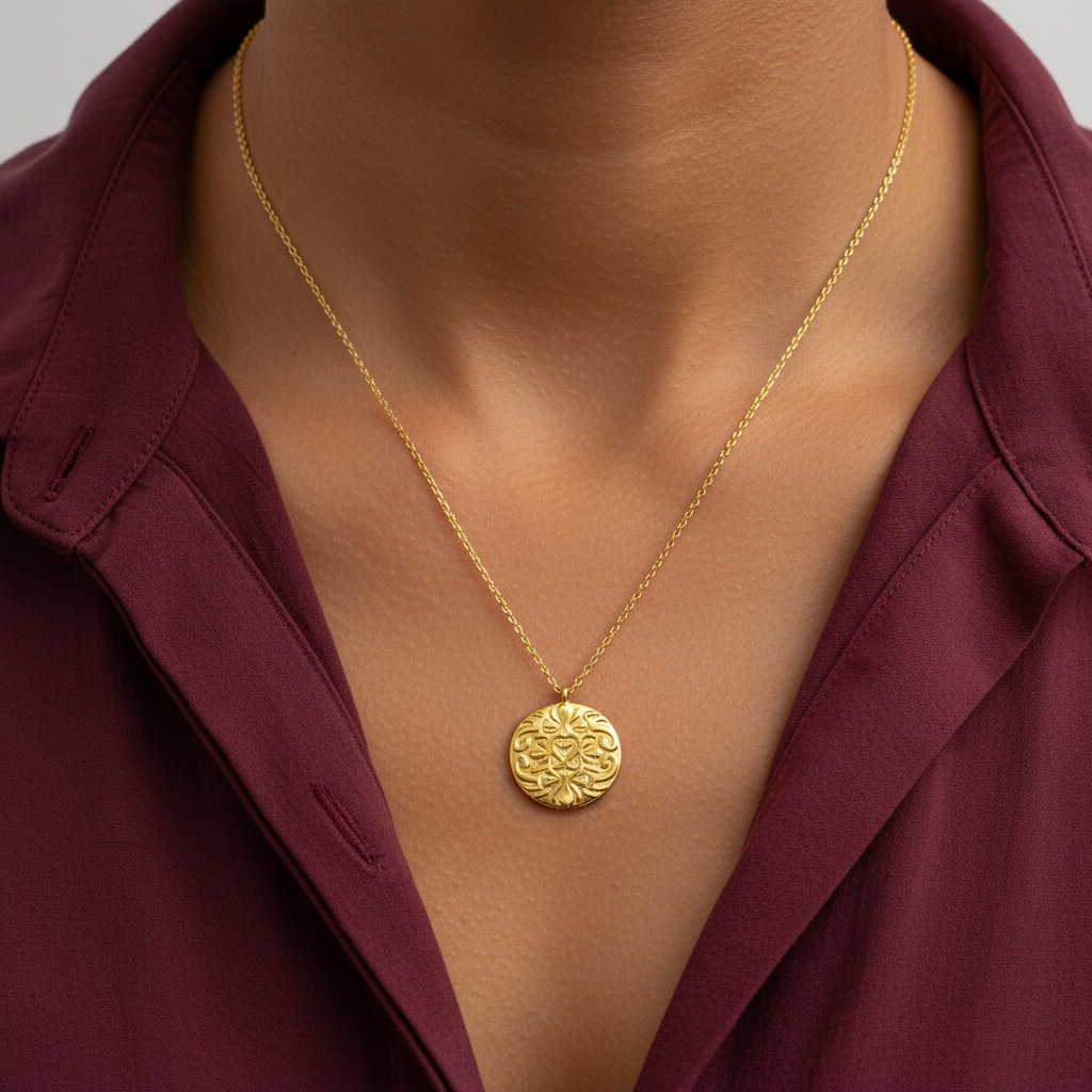 Discover refined elegance with the Cessani Aurelia Embossed Necklace. Crafted with a brass core and finished in radiant gold plating, this pendant showcases a beautifully embossed design that reflects the signature artistry of Cessani.