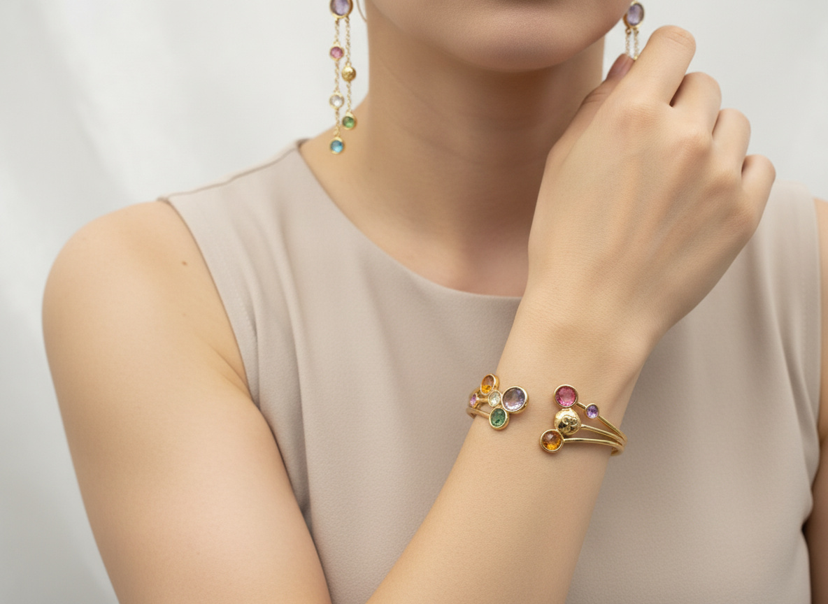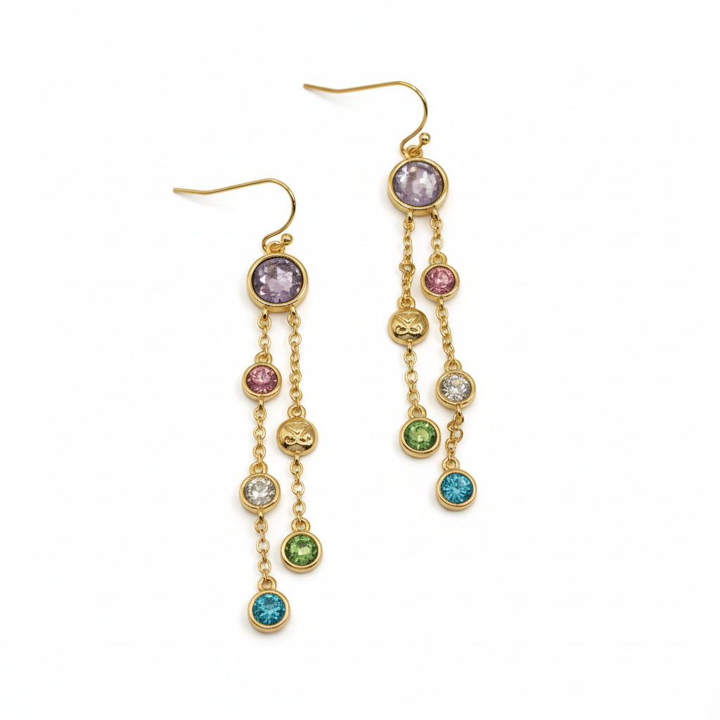 These exquisite multi-gem cascade earrings from Cessani are designed to bring colour, light and effortless sophistication to your jewellery collection. Each earring features a delicately crafted gold-tone setting adorned with an array of vibrantly faceted stones in turquoise, green, pink, lilac and crystal tones. The dual-strand drop design creates graceful movement, allowing the gems to catch the light with every step.