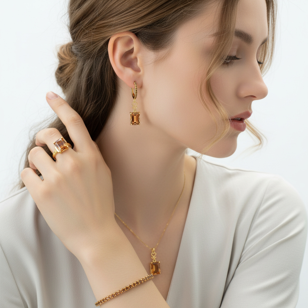 Its clean, modern silhouette makes it perfect for customers searching for gold crystal rings, minimalist statement rings, elegant fashion jewellery, or timeless everyday accessories. Comfortable and versatile, it can be worn as a standalone highlight or paired seamlessly with the Honeylight Elegance Bangle, Pendant, and Earrings for a coordinated Cessani ensemble.