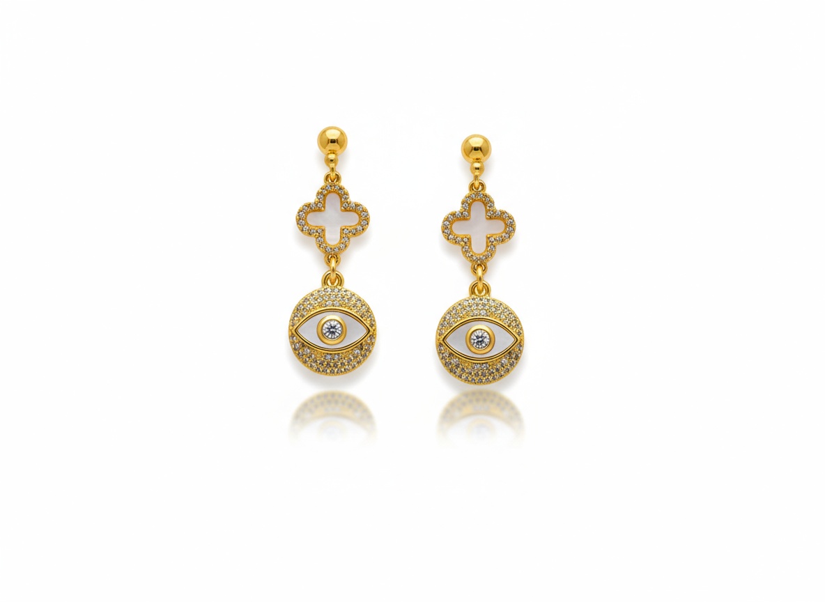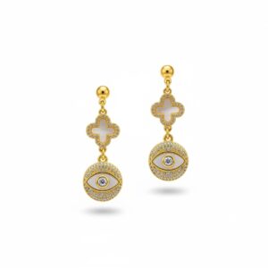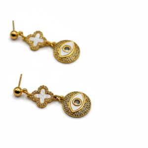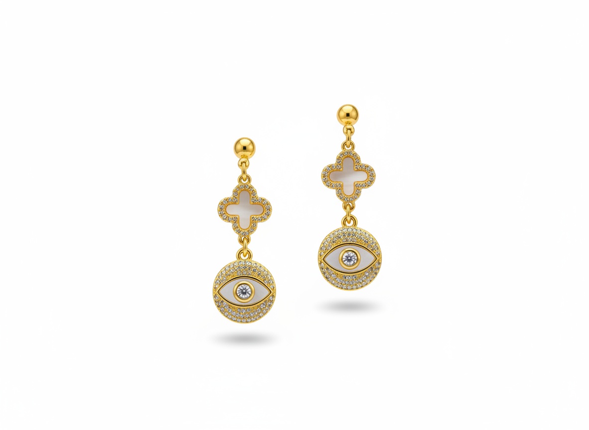 Malu` Evil Eye Crystal Drop Earrings: These elegant earrings feature protective evil eye charms paired with sparkling crystals that catch the light beautifully. Radiating sophistication and symbolic allure, they’re perfect for everyday elegance or adding a meaningful touch to special occasions.