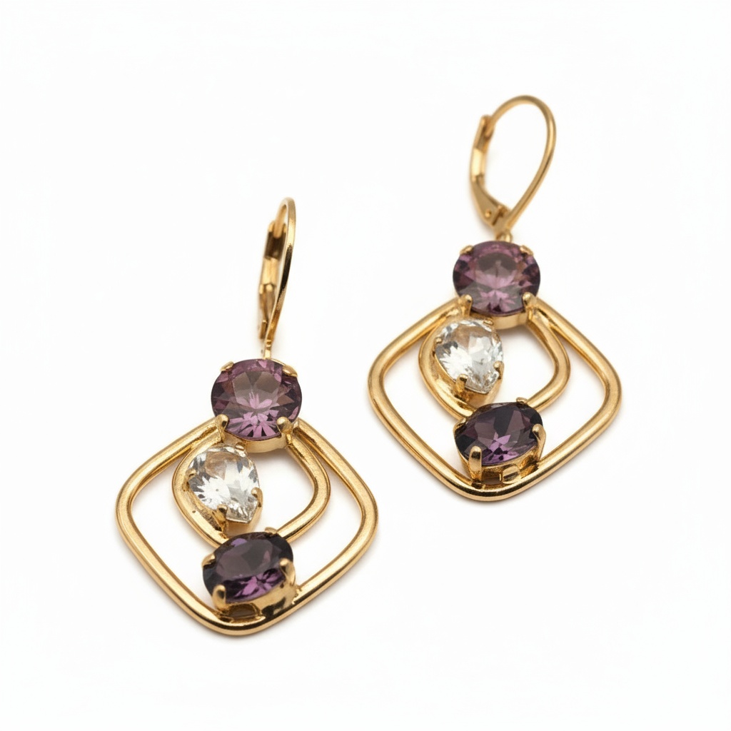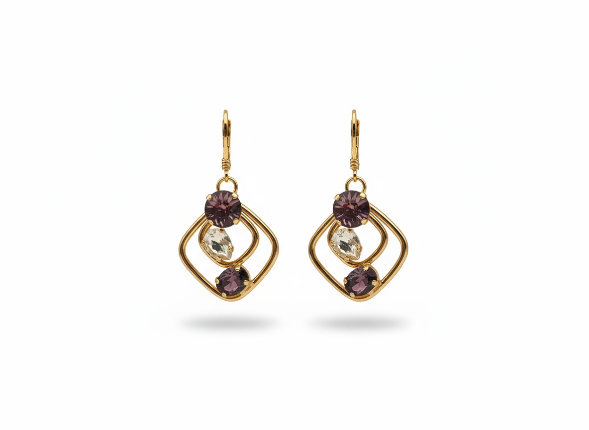 The Malu Square-Frame Earrings capture the perfect harmony of modern geometry and classic luxury. Expertly crafted with a radiant gold-toned finish, each earring showcases a delicately sculpted open-square frame that cradles two sparkling amethyst crystals and a luminous clear stone.