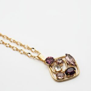 Inside the frame, a stunning arrangement of amethyst and clear crystals creates a rich interplay of light and colour — each stone expertly cut and set to enhance its brilliance. The pendant’s unique geometry and artful balance embody Cessani’s signature fusion of elegance and innovation.