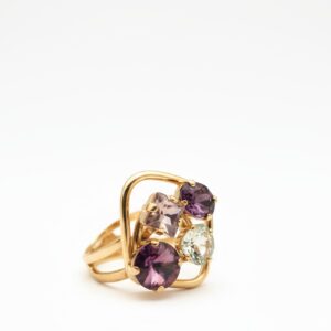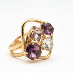 Within its graceful frame, sparkling amethyst and luminous clear crystals are artfully arranged to capture light from every angle, creating a harmonious play of color and brilliance. The geometric silhouette lends a contemporary edge, while the soft hues of the stones evoke understated glamour.